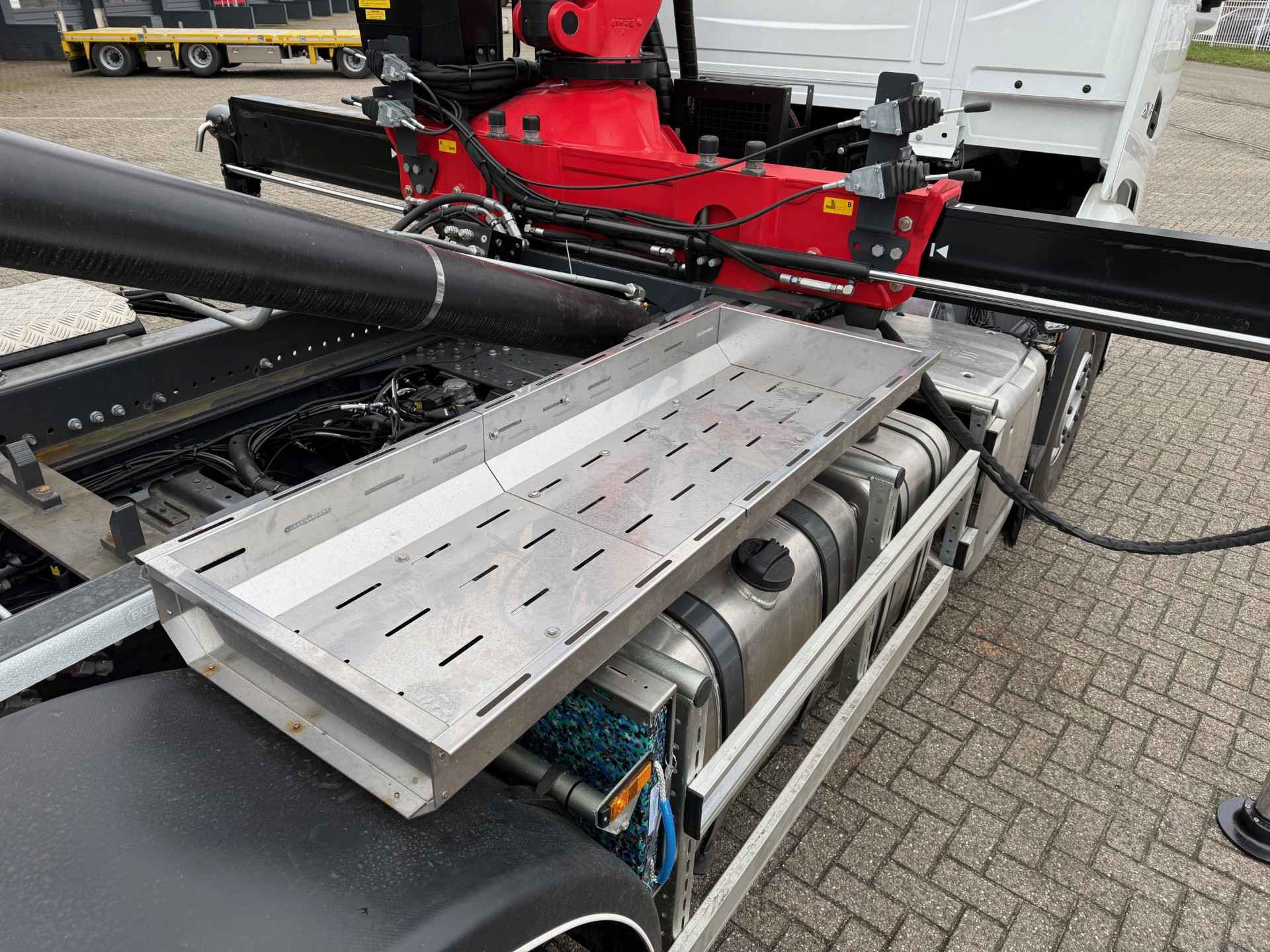 * FAB6: Benedenbediening voor de steunpootkokers en steunpootfuncties d.m.v. kabels (de steunpootkokers zijn separaat hydraulisch uitschuifbaar).
