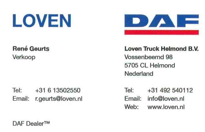 Prijs op basis van zo meenemen, vraag naar de voorwaarden! Diverse voertuigen op voorraad! Alle trucks die wij aanbieden kunt u geheel naar eigen wens samenstellen. Wenst u bijvoorbeeld extra verlichting, zwaailampen of de truck gelijk in uw kleur? Wij regelen het graag! Antoine Waque Trucks +31 6 575 717 35 a.waque@loven.nl en voor Eschweiler Duitsland Enric Budesheim +49 172 832 7136 e.budesheim@loveneschweiler.de